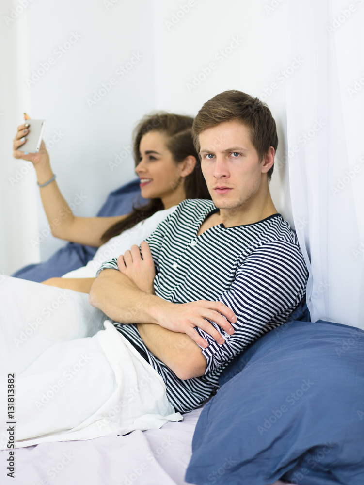 Sad Man Looking Disappointed By His Wife While She Is Making Self Photos On Mobile Or Smart Phone In Bed People Sleeping In Bed Stock Photo Adobe Stock